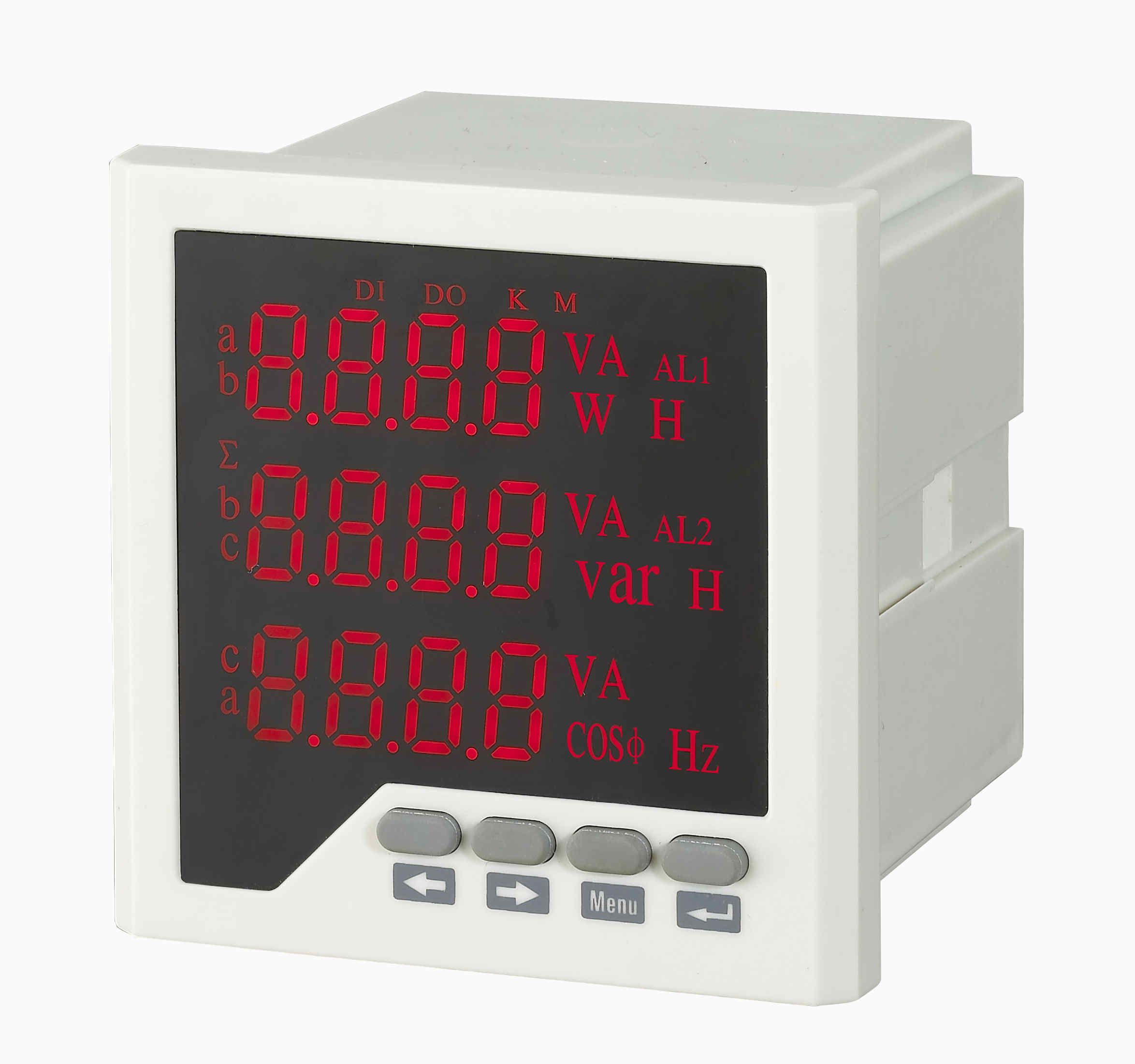 電力儀表,一種具有可編程測(cè)量、顯示、RS485數(shù)字通訊和電能脈沖輸出的多功能智能電力儀表,能夠完成三相電參量測(cè)量(三相電壓、三相電流、有功功率、無功功率、視在功率、功率因數(shù)、頻率等)、諧波測(cè)量、電網(wǎng)質(zhì)量分析(電壓波峰系數(shù),電流K系數(shù),電話波形因子,電壓電流不平衡度,電壓電流序量等)、四象限電能計(jì)量、復(fù)費(fèi)率電能計(jì)量、最大需量記錄、SOE事件記錄、數(shù)據(jù)顯示、采集及傳輸,可廣泛應(yīng)用變電站自動(dòng)化、配電自動(dòng)化、智能建筑、企業(yè)內(nèi)部的電能測(cè)量、管理、考核。測(cè)量精度0.5級(jí),實(shí)現(xiàn)LCD現(xiàn)場(chǎng)顯示和遠(yuǎn)程RS-485數(shù)字接口通訊,采用標(biāo)準(zhǔn)MODBUS-RTU通訊協(xié)議。