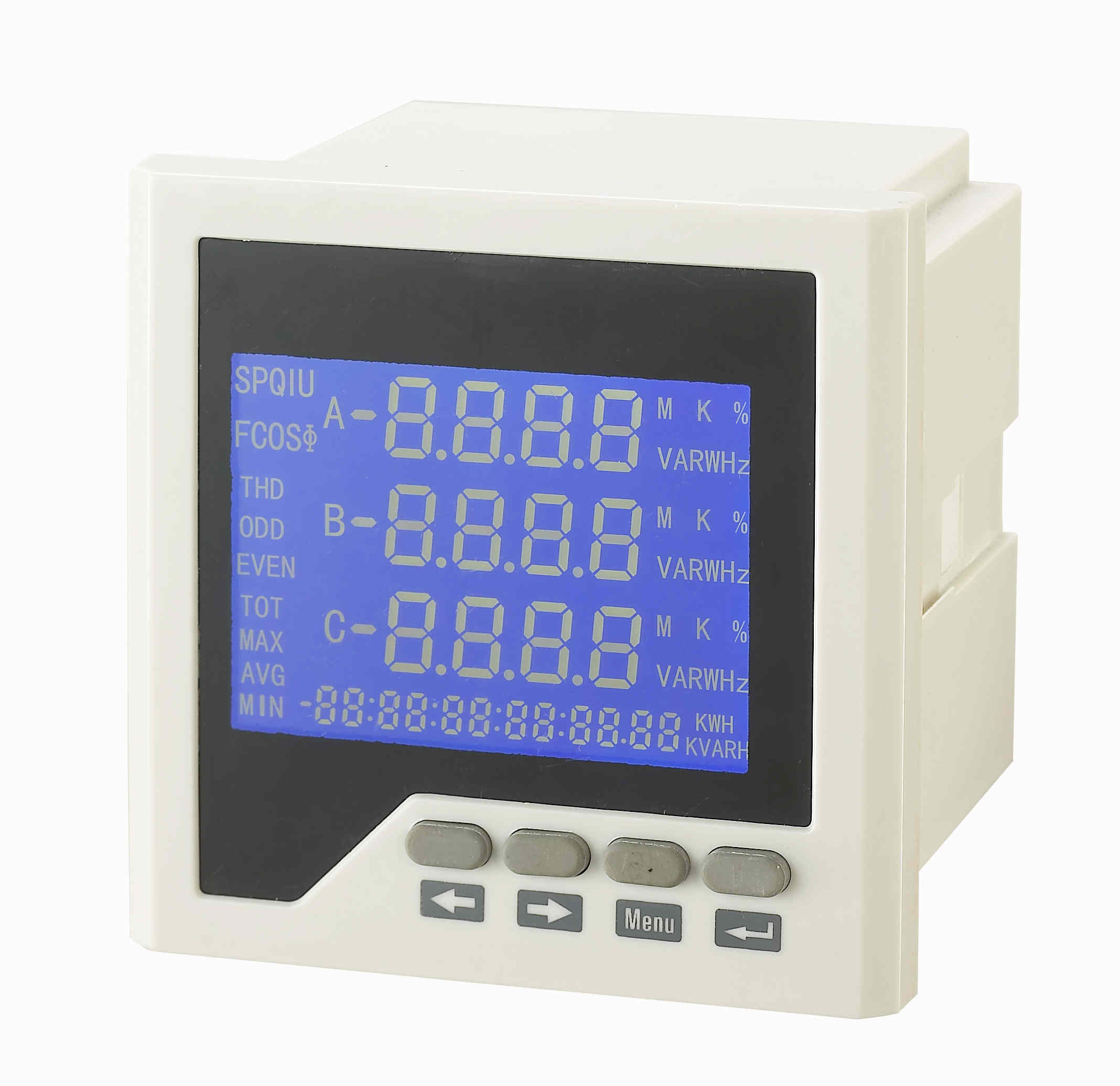 電力儀表,一種具有可編程測量、顯示、RS485數字通訊和電能脈沖輸出的多功能智能電力儀表,能夠完成三相電參量測量(三相電壓、三相電流、有功功率、無功功率、視在功率、功率因數、頻率等)、諧波測量、電網質量分析(電壓波峰系數,電流K系數,電話波形因子,電壓電流不平衡度,電壓電流序量等)、四象限電能計量、復費率電能計量、最大需量記錄、SOE事件記錄、數據顯示、采集及傳輸,可廣泛應用變電站自動化、配電自動化、智能建筑、企業內部的電能測量、管理、考核。測量精度0.5級,實現LCD現場顯示和遠程RS-485數字接口通訊,采用標準MODBUS-RTU通訊協議。